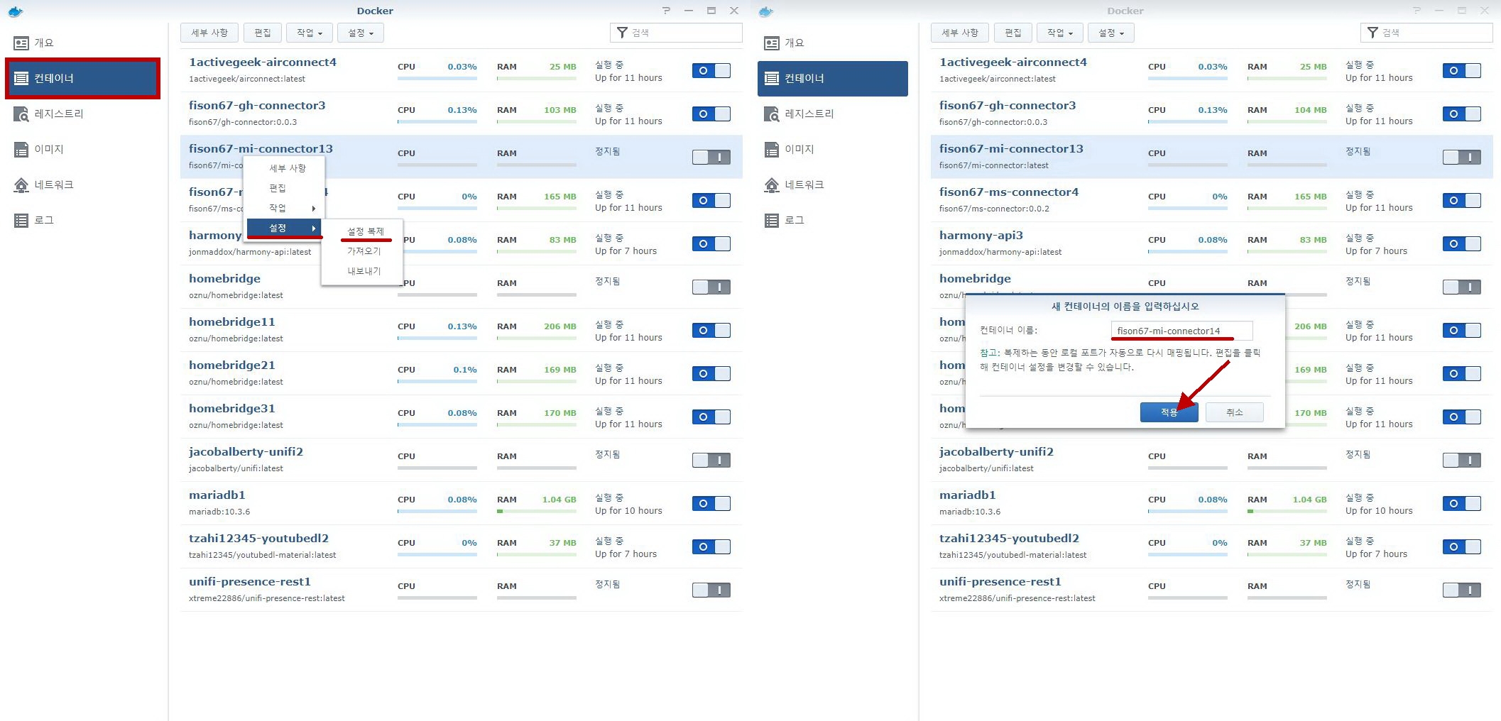 新컨테이너(mi-connector15)를 시작하고, 舊컨테이너(mi-connector14)의 우측 마우스를 클릭하여 [작업->삭제]한다.