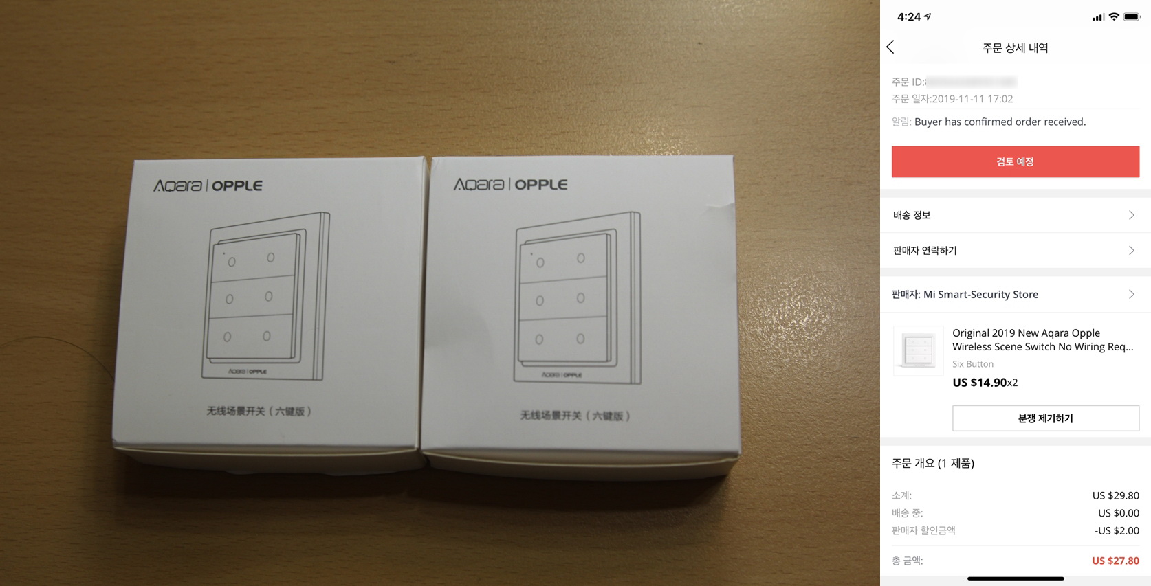광군절에 알리에서 신형 아카라 6구 버튼 2개를 27.8 달러에 구매하였는데,