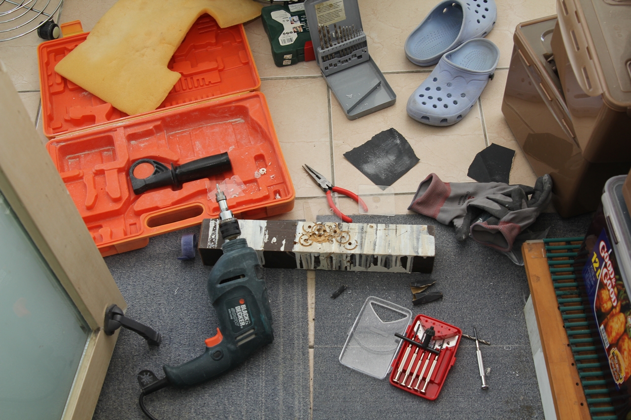뒷베란다에 쭈그리고 앉아서 내장을 제거하고 아크릴과 포맥스에 홀쏘와 드릴로 15mm와 5mm 천공을 하여서,