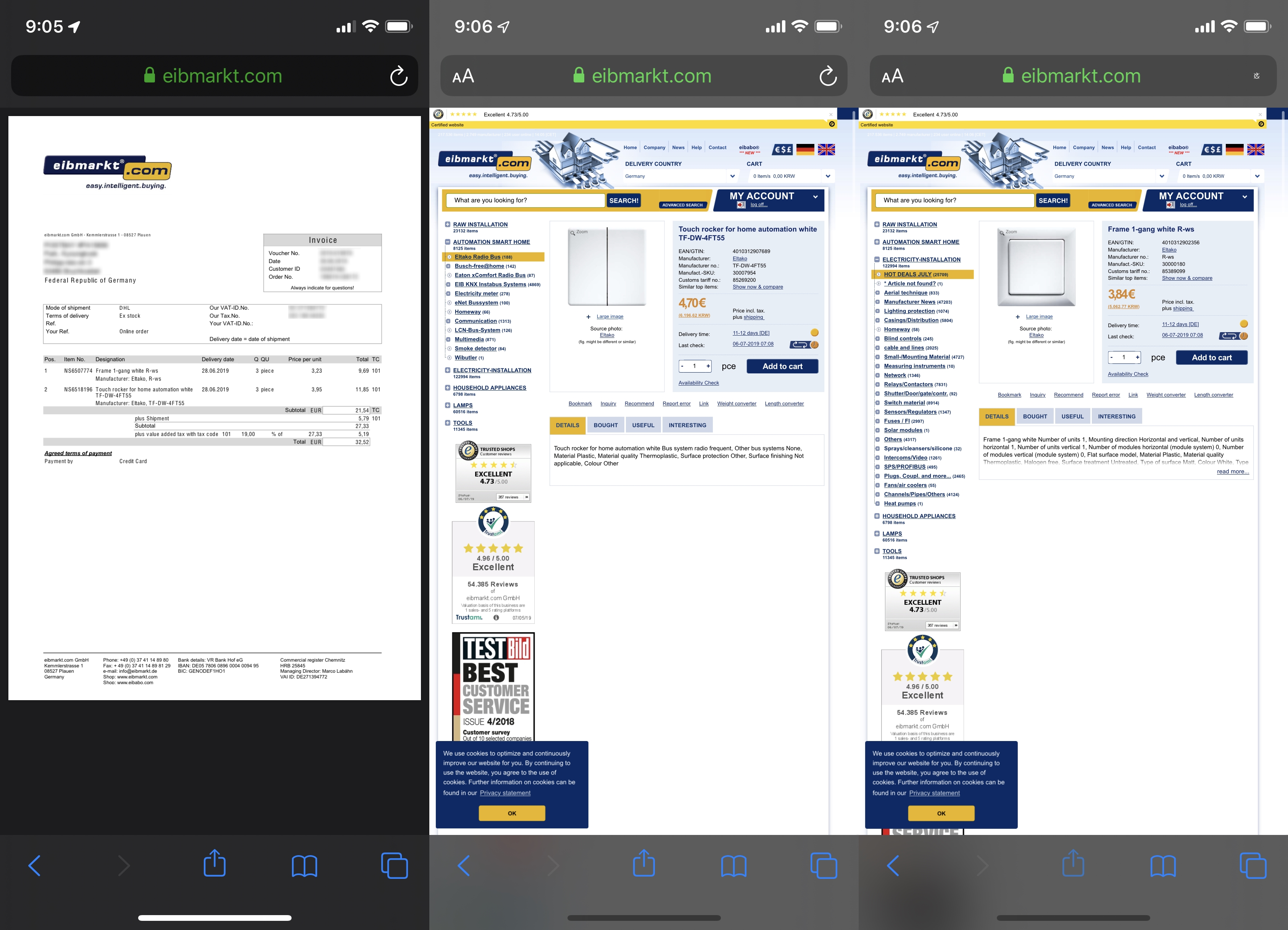 eibmarkt.com이라는 독일 쇼핑몰에서 더블 로커 스위치 버튼 3세트와 케이스 3개를 32.52 유로에 구매하여,