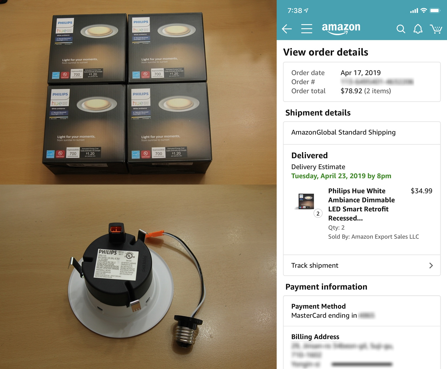 필립스 휴 4인치 다운라이트를 아마존에서 개당 34.99달러에 4개를 구매하였고,