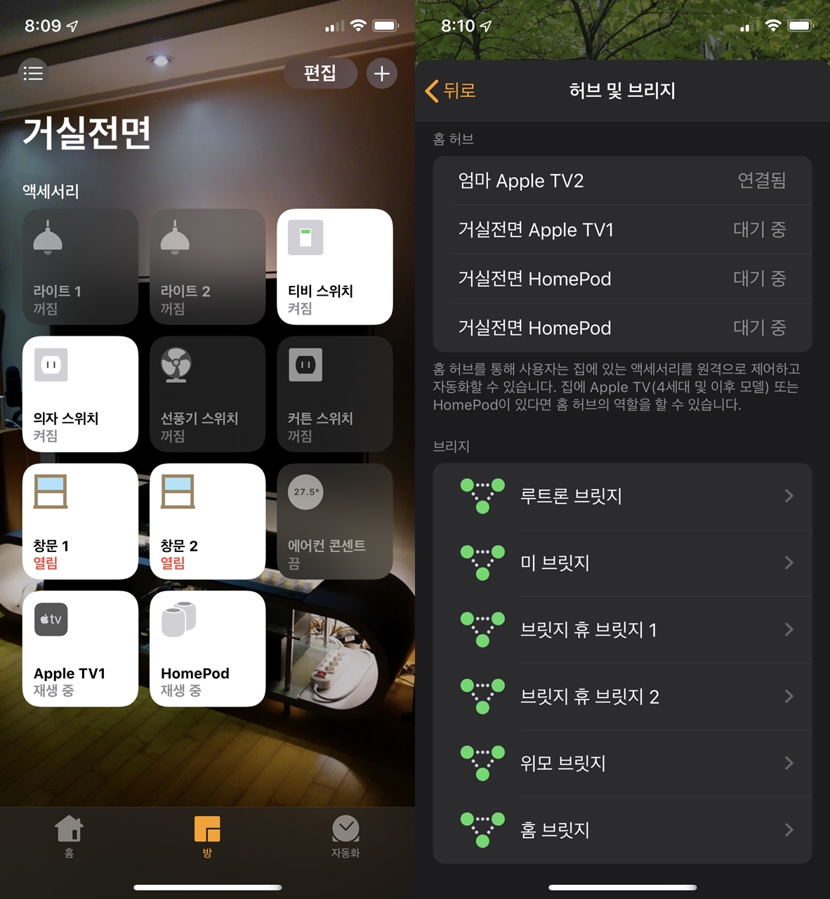 그리고 내 최대 관심사인 홈킷 허브의 갯수를 살펴 보았는데 두 놈이 따로따로 작동하였으며 홈팟 시리(siri)는 검둥이 한 놈만 작동하더라.