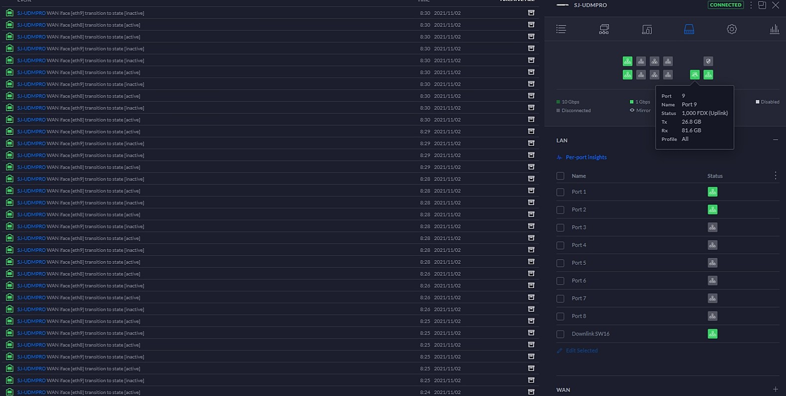 11월 1일엔 접속이 오락가락(Active-Inactive)하며 인터넷 속도가 100MB로 떨어졌으며,