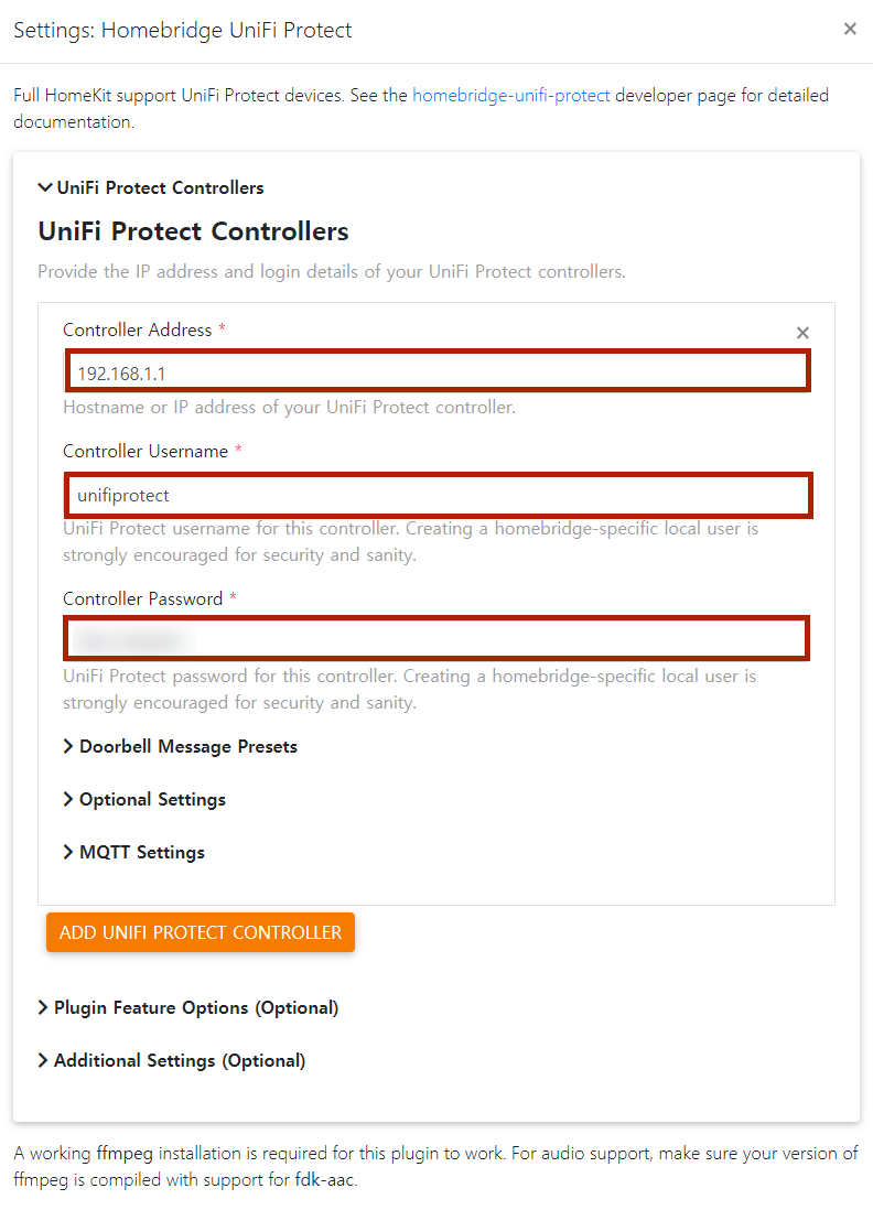 그리고 홈브릿지 플러그인 설정에서 Controller Address, Username, Password를 입력 후 저장하고,