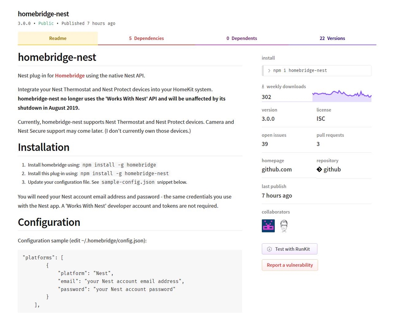 네스트(Nest)와 홈킷(Homekit)간의 홈브릿지 연동 방법은 npm 문서속에 자세히 기술되어 있다.