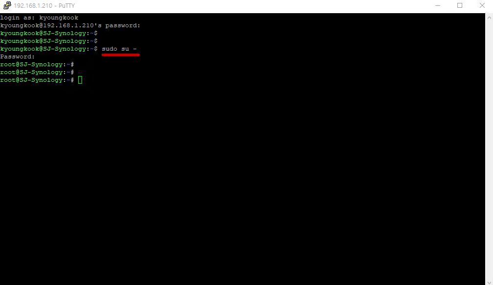 2) PuTTY 또는 SSH로 시놀로지에 로그인하여 루트 계정($sudo su - )으로 전환