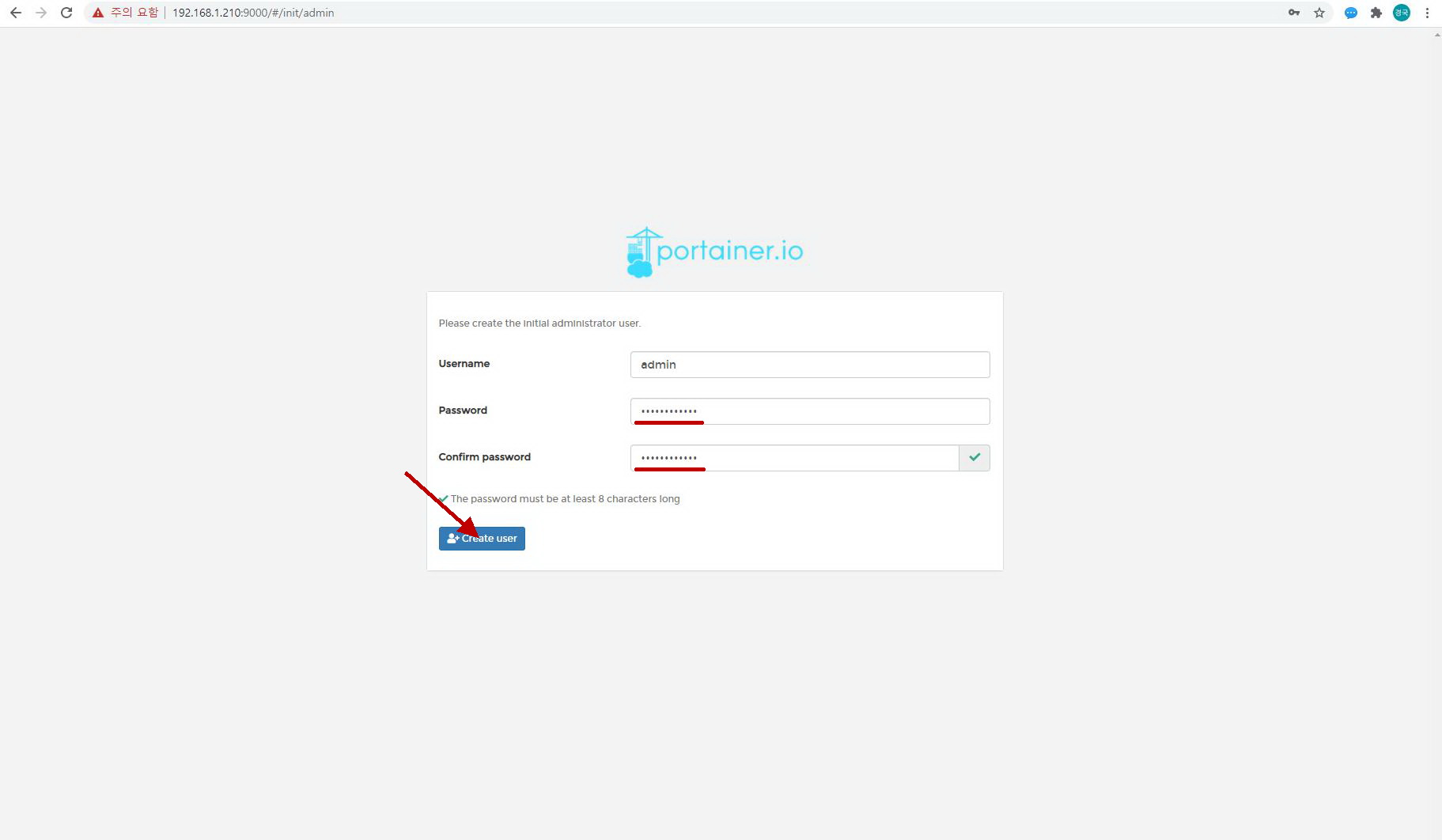 사용자 이름과 패스워드를 2번 입력하고 계정(Create User)을 생성