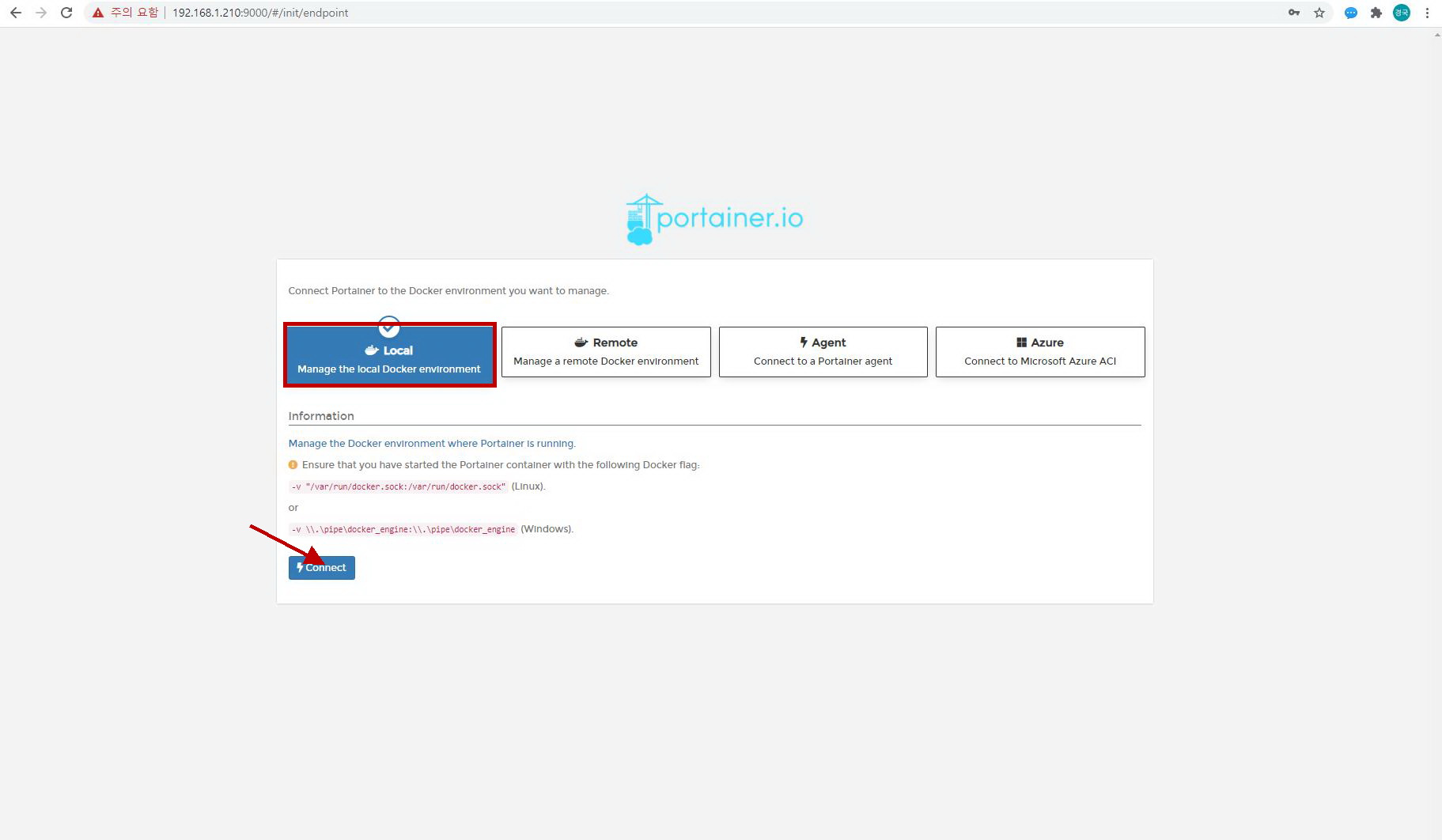 1) 웹브라우저에 '시놀로지 IP:9000'을 입력하여 포테이너에 접속하여,