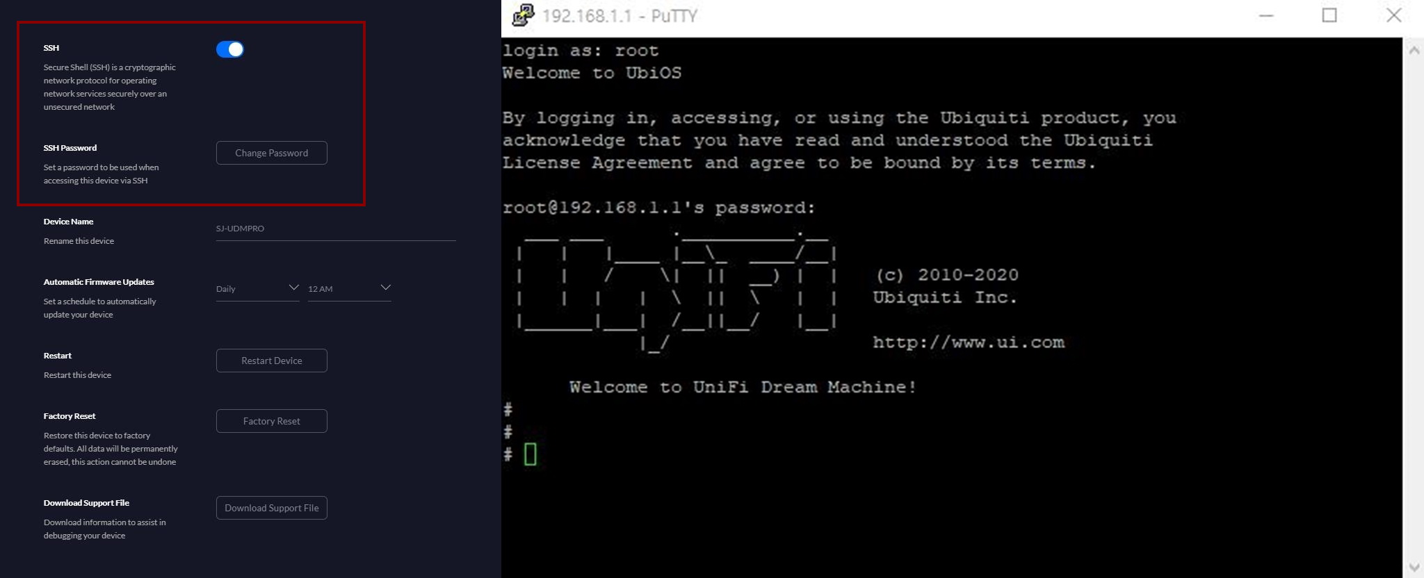 단말 프로그램(PuTTY등)에서 UDM Pro로 직접 접근을 하지 못하여 정말로 한참을 헤메다가,