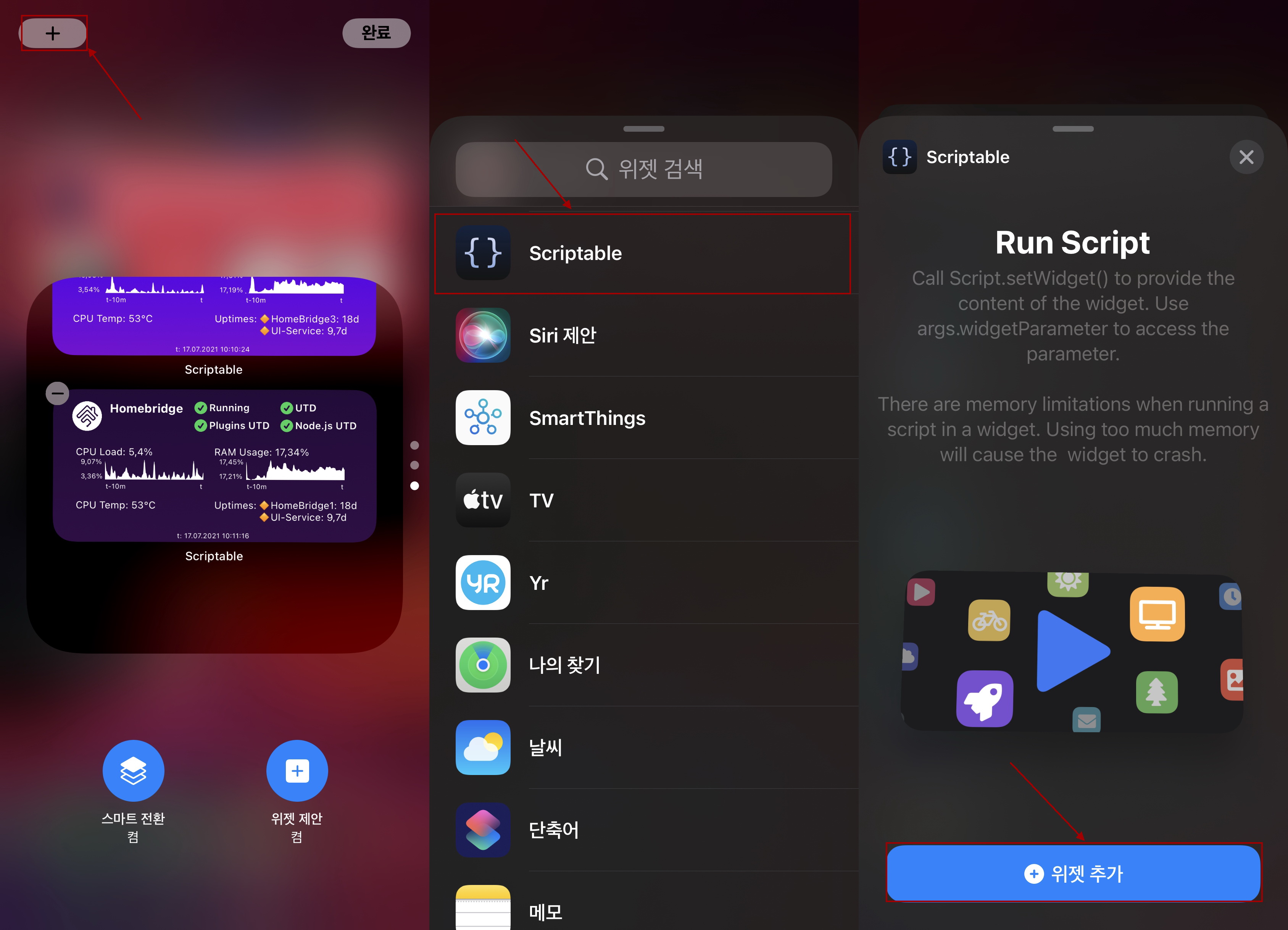 스마트 스택 위젯에서 '+'->위젯(Scriptable) 선택->'+ 위젯 추가'