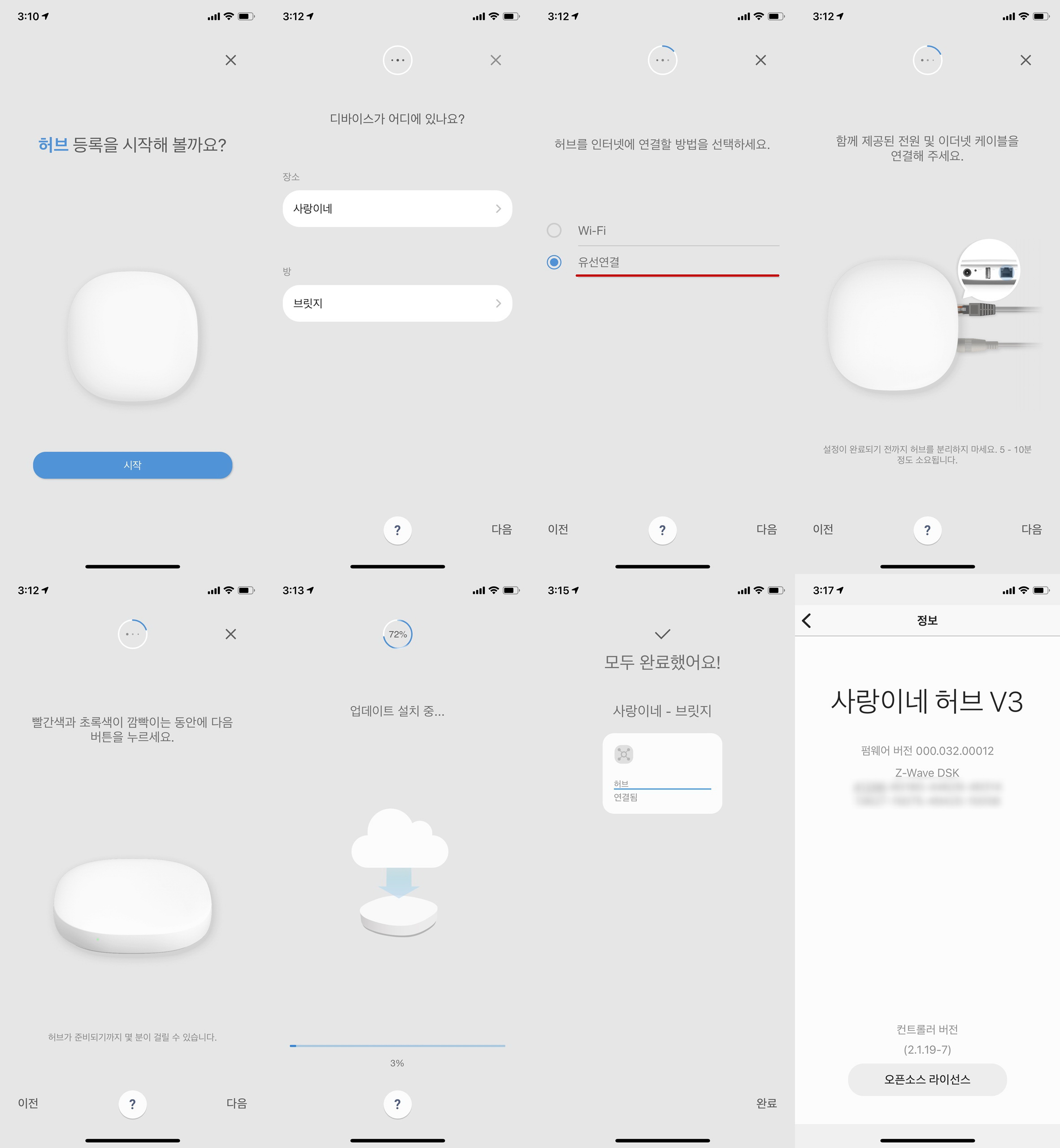 2단계에서 실제 설정 작업이 진행되었는데, 허브와 같은 부모 장비들은 가능하면 유선랜에 연결하는 것을 명심하자.