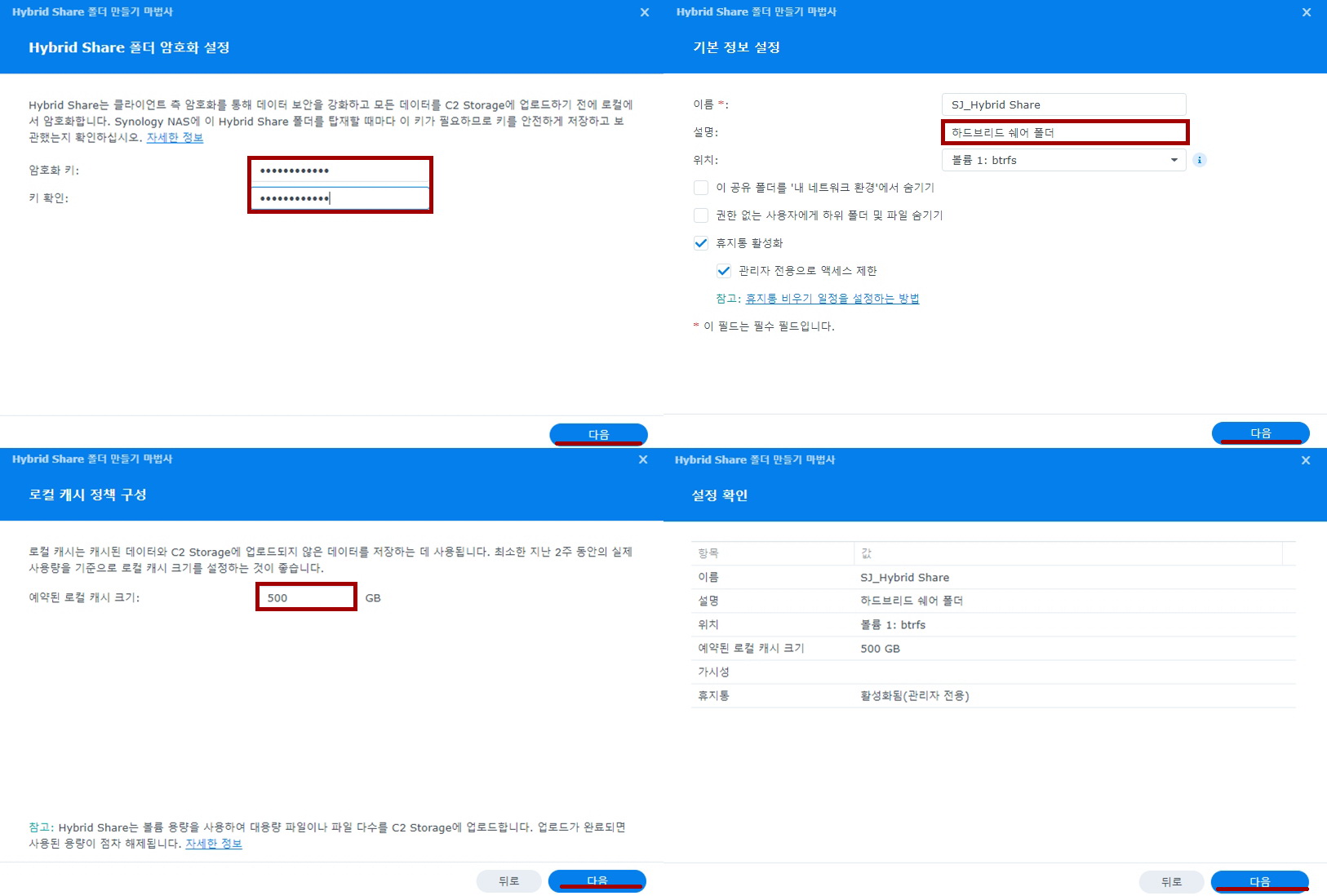 'Hybrid Share 폴더 암호화 설정'에선 암호화 키(Vault Key)를 2번 입력하고,