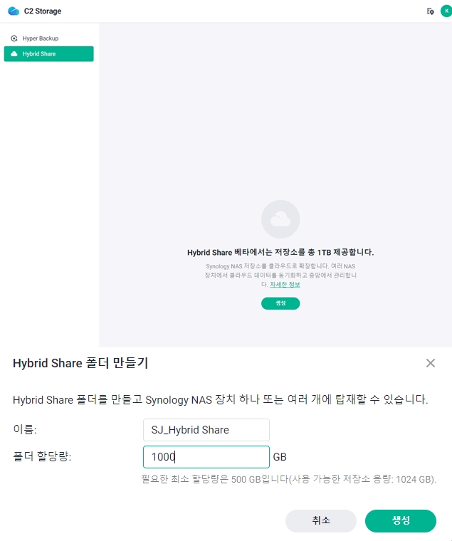 C2 Storage 관리 화면에서 하이브리드 쉐어 폴더를 생성해야 하는데,