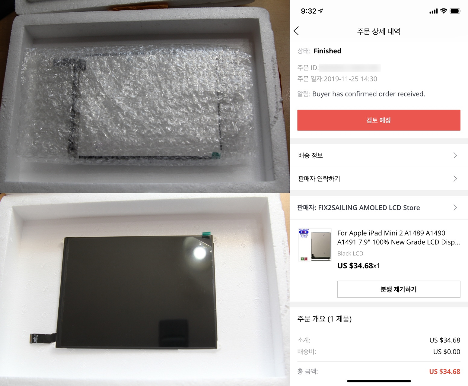 알리에서 액정을 34.68 달러에 구매했는데 스치로폼 박스에 담겨 나름 안전하게 배송이 되었다.