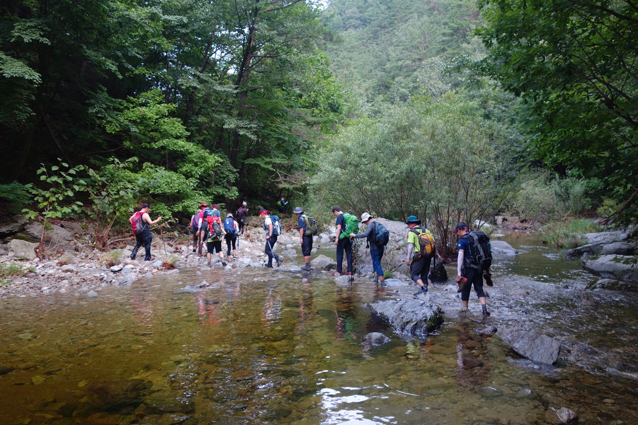 덕풍계곡에서는 계곡물을 수십 번은 건너야 하는데,