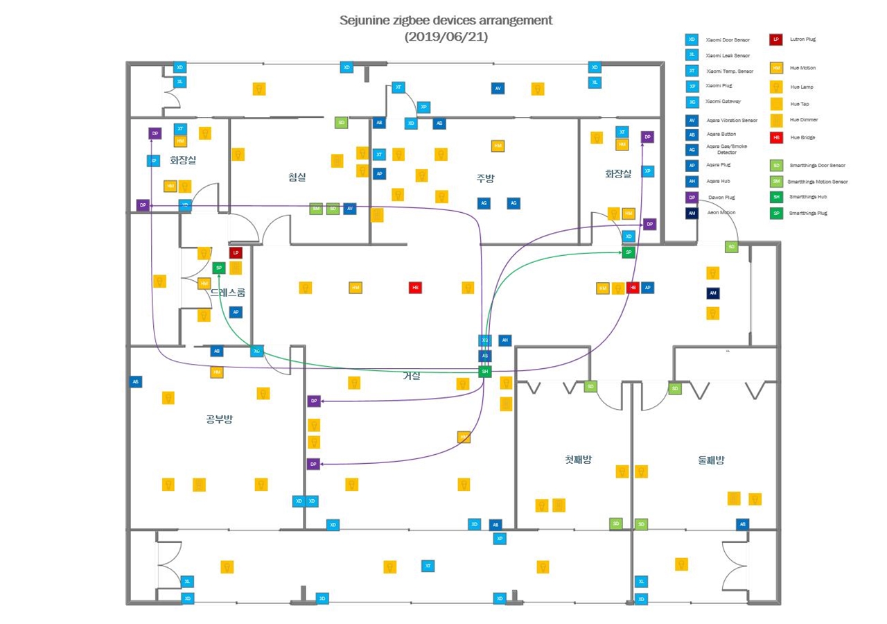 이제는 거실, 안방화장실, 공용화장실의 다원 플러그(보라색) 6개도 ST 리피터 구실을 하게 되었다.