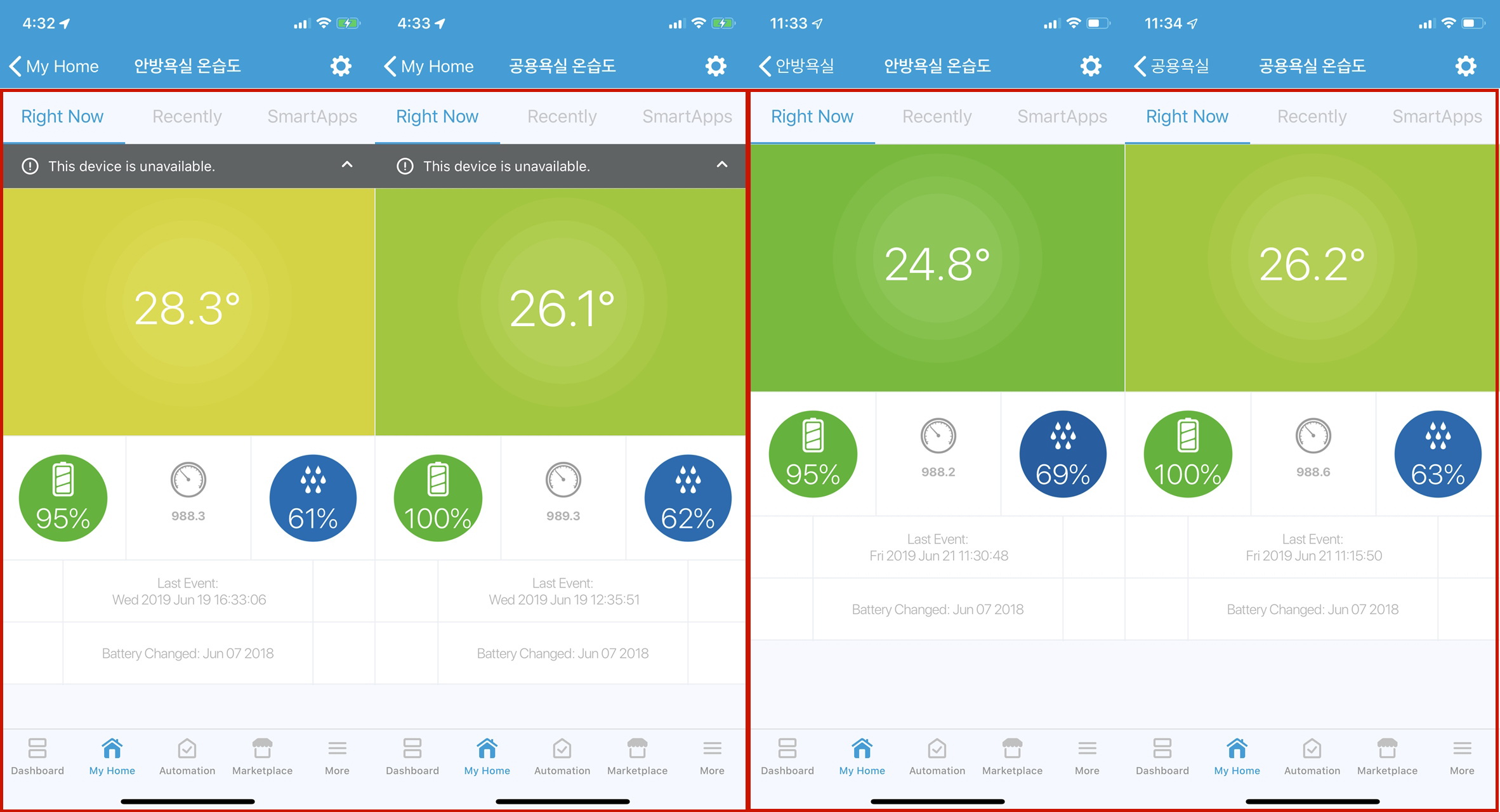 ST에 직결된 온습도 센서와 도어 센서가 30분 정도가 지나자 떨어지는 것으로 미루어 리피팅이 되나 보다.
