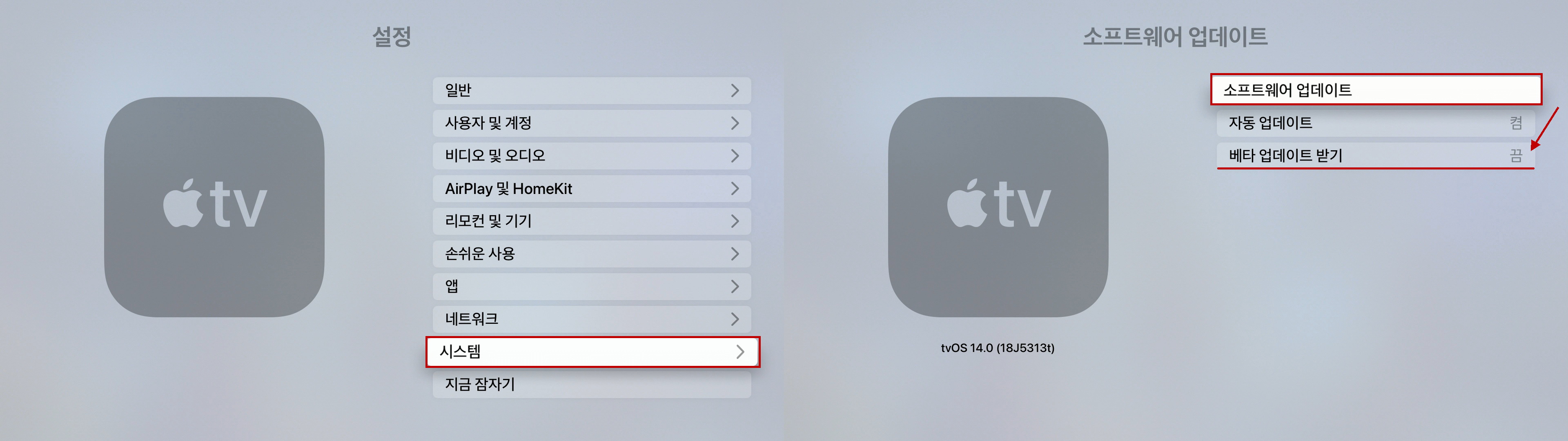그다음 '시스템-소프트웨어 업데이트'에서 실제 tvOS 14 Beta를 설치하는데,