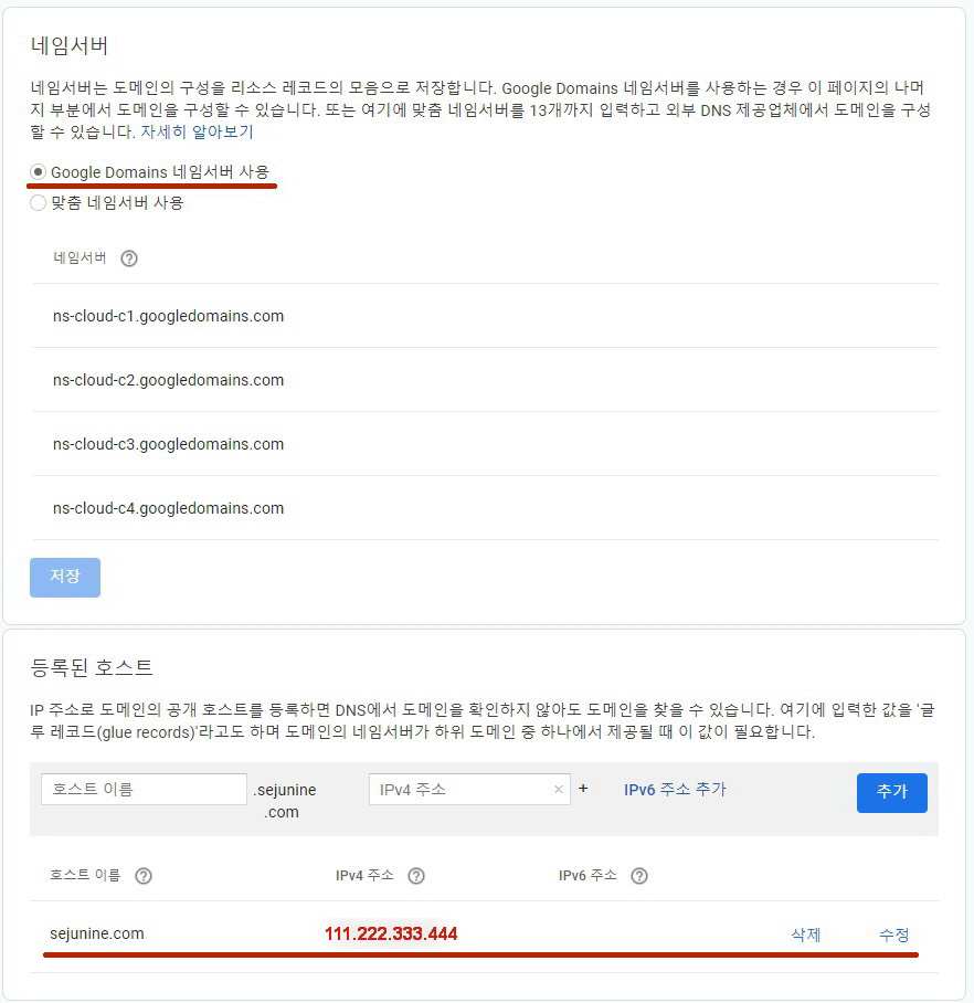 도메인 등록은 구글 도메인에서 '네임서버'를 "Google Domains 네임서버 사용"으로 선택하고,