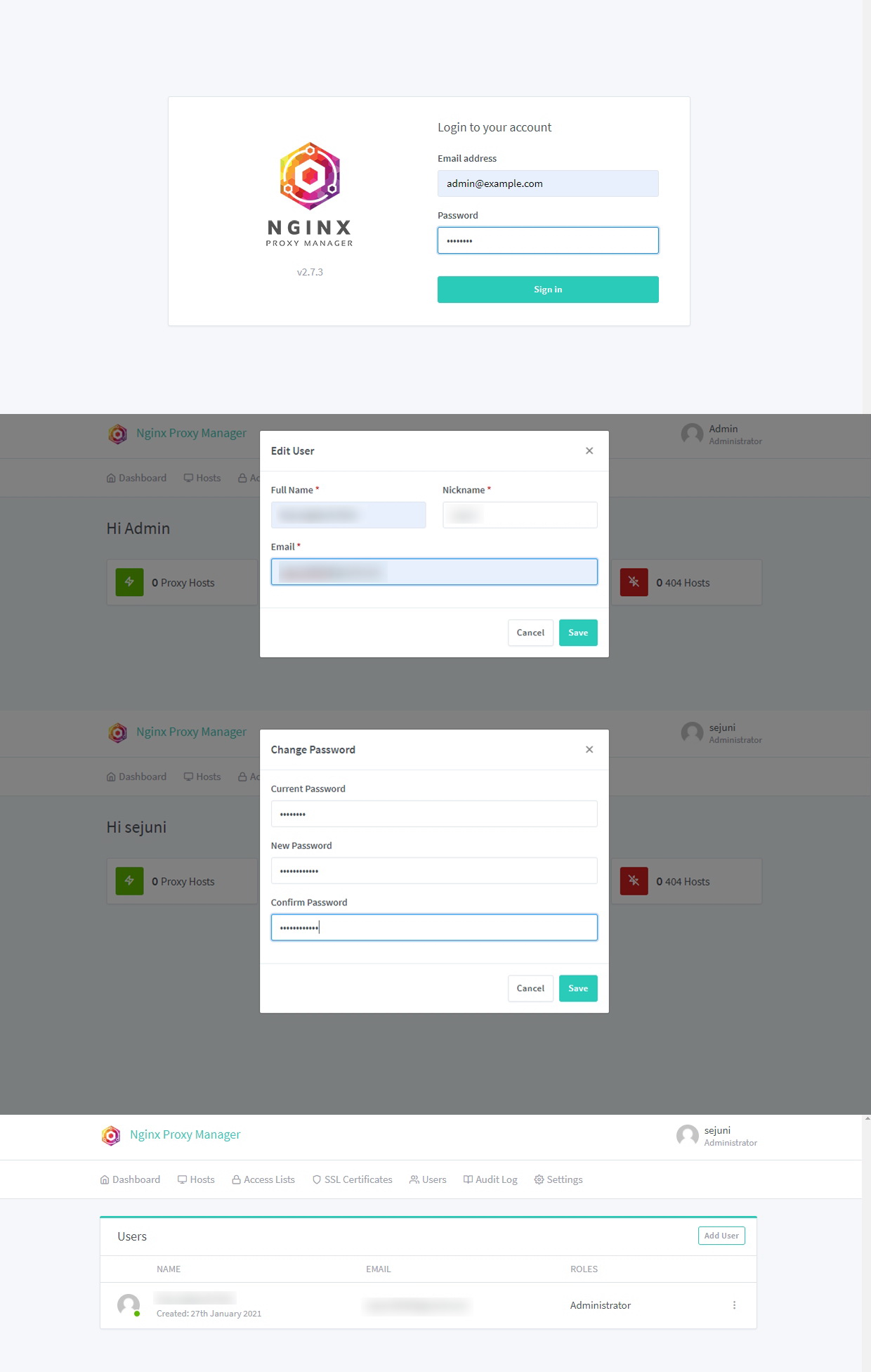 계정을 만들고 비밀번호를 수정하면 Nginx Proxy Manager 사용이 가능하다.