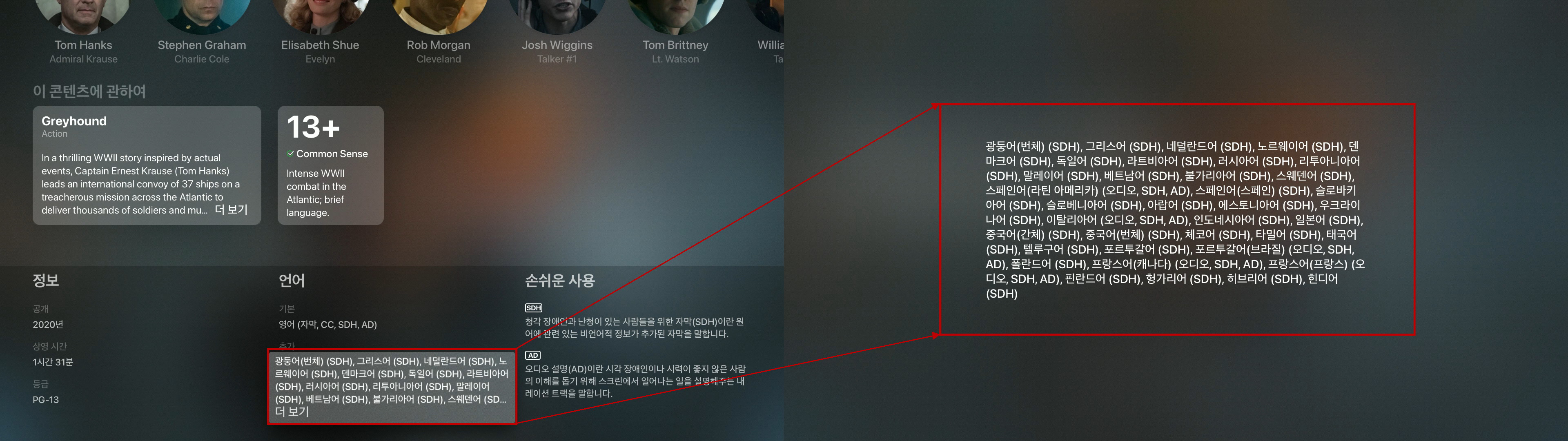 그래서 휴일 새벽에 애플티비의 펌웨어 업데이트를 마치고, 그레이하운드를 보고자 하였으나 여전히 우리말 자막이 없다.ㅠㅠ