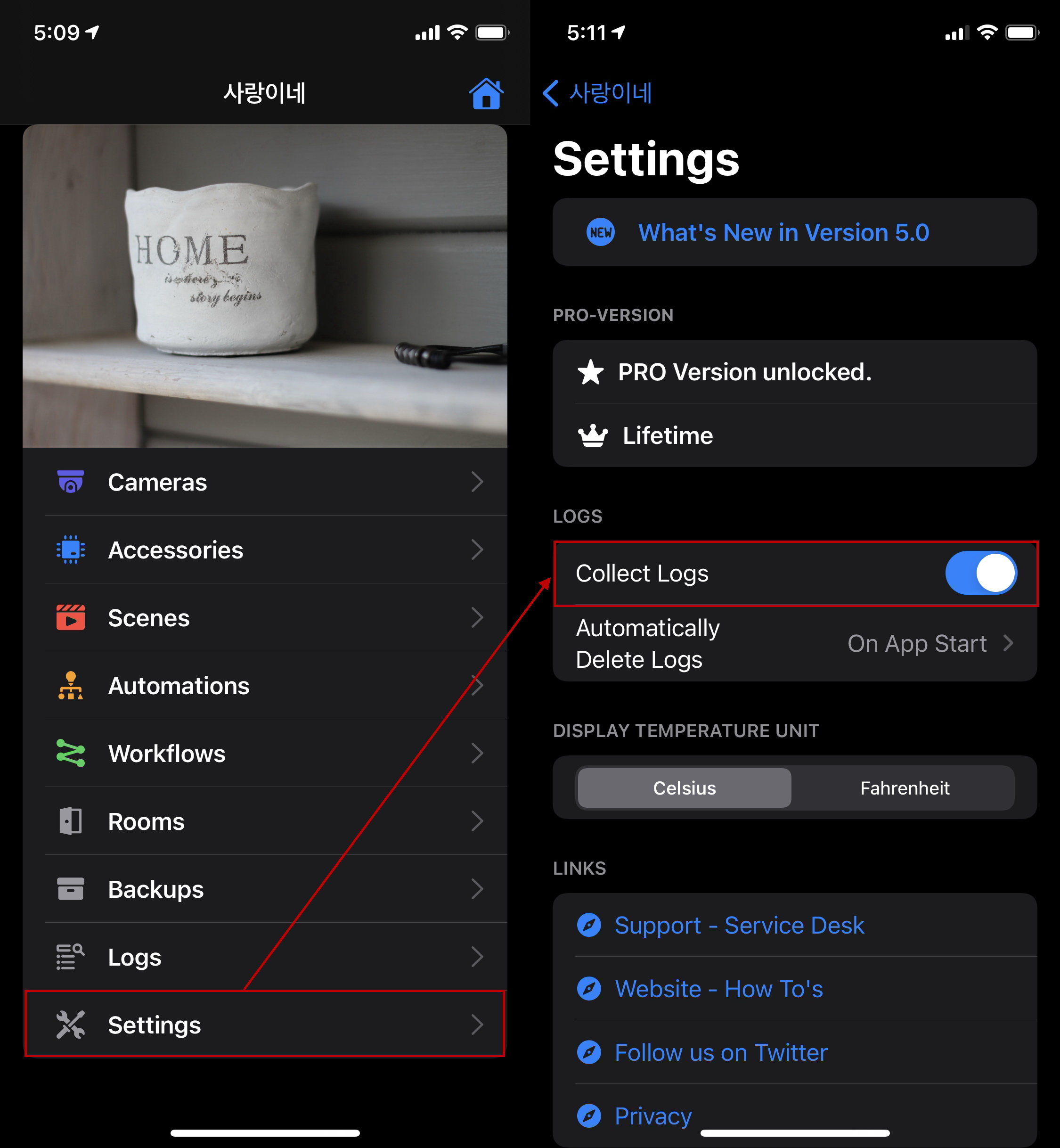 설정은 Controller for Homekit 어플의 'Settings'에서 'Collect Logs'를 enable 시키고,