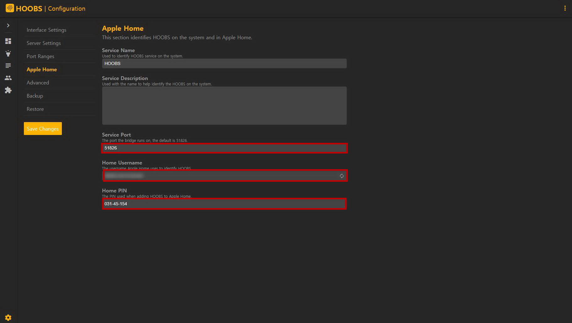 4) 애플 홈 설정에서는 홈브릿지 기본값으로 서버 포트(51826), 사용자 이름(Mac주소), 홈핀(031-45-154)이 들어가 있더라.