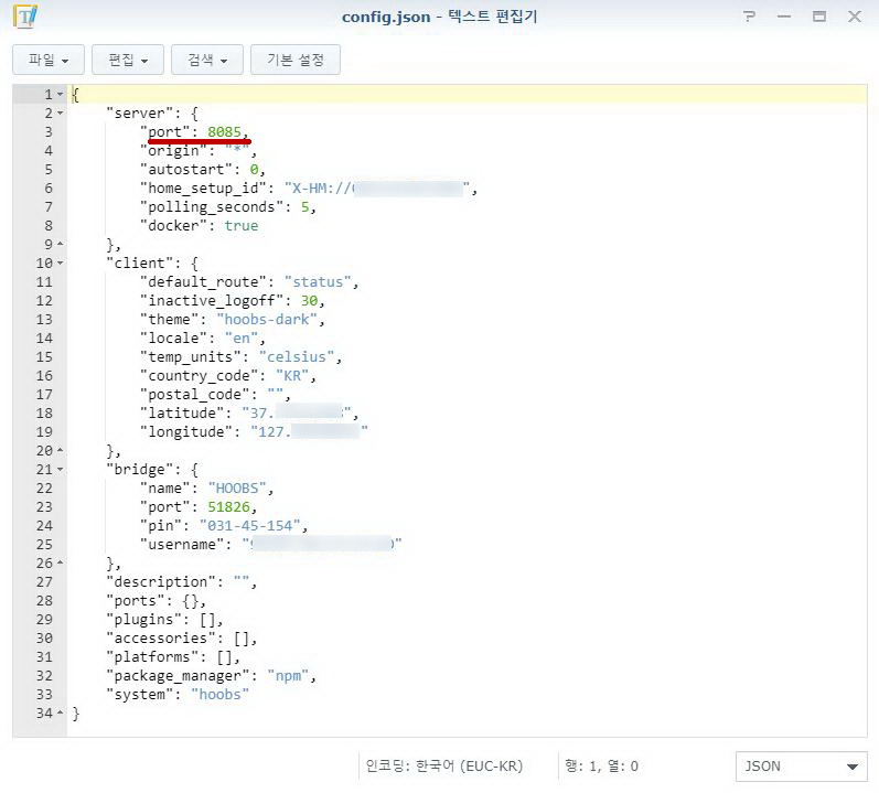 5) 그리고 HOOBS config.json도 웹화면에서 수동으로 수정이 가능하다.