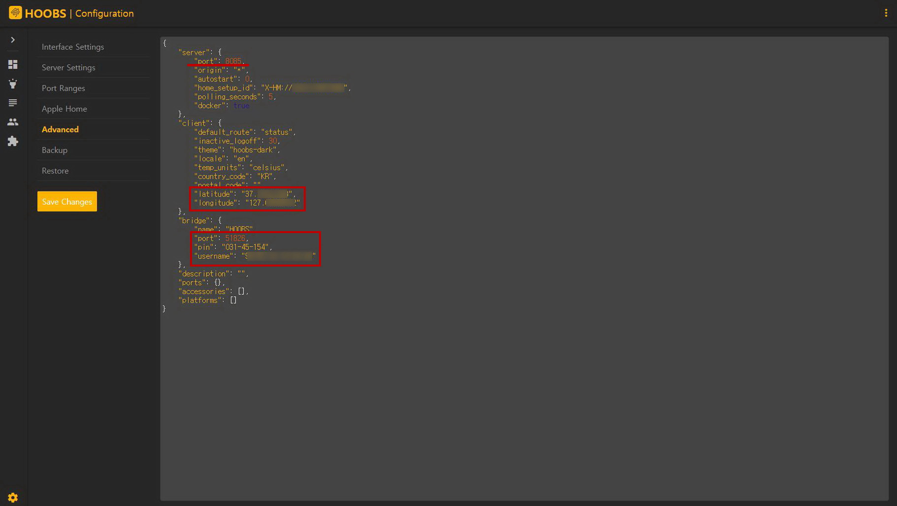2) HOOBS 인터페이스 설정의 언어에는 '한국어'도 있었으나 너무 허접하여 'English'로 두었으며, 온도 단위, 국가 코드, 경위도 정도만 수정하였다.