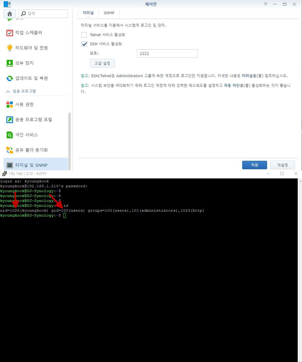 우선 시놀로지의 '제어판->터미널 및 SNMP'에서 SSH 서비스를 활성화시키고,