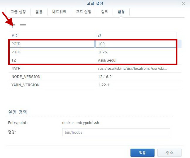 5) 환경 탭에서는 TZ은 Asia/Seoul로, PUID와 PGID는 위의 SSH에서 적어놓은 값을 그대로 각각 입력한다.