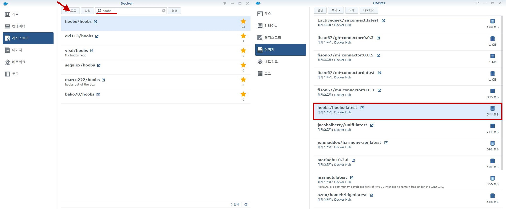 1) 레지스트리 메뉴에서 'hoobs'를 입력하고 최신버전(latest)을 다운로드하면 544MB 크기의 이미지가 내려온다.