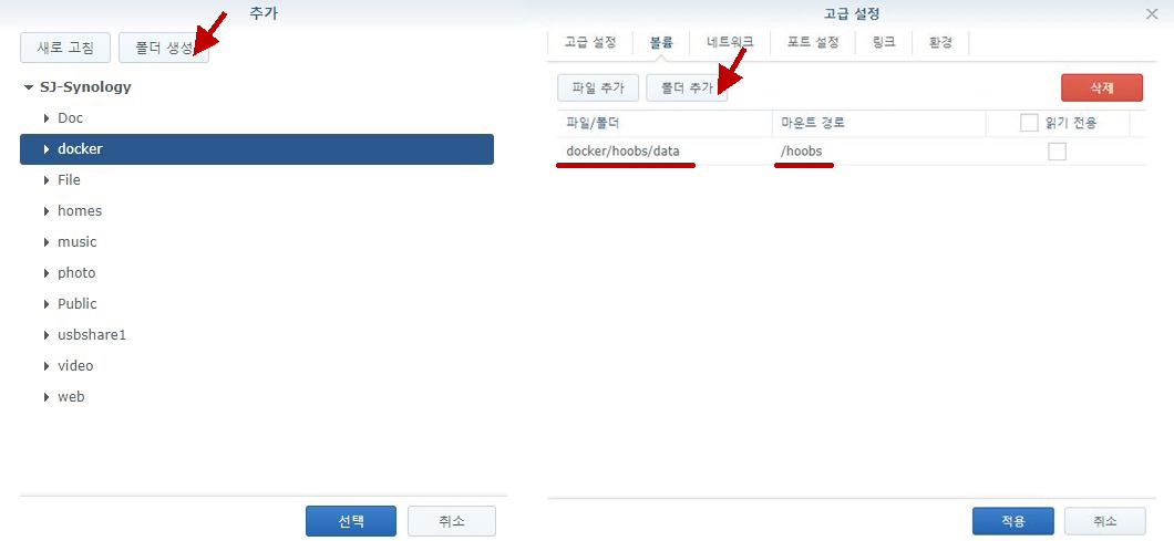 3) 볼륨 탭에서 '폴더 생성'을 눌러서 /docker/hoobs와 /docker/hoobs/data 폴더를 생성하고,