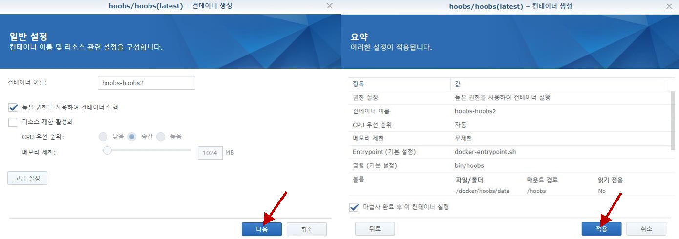 6) 그리고 '다음'을 누르고 '적용'을 누르면 HOOBS 컨테이너가 실행되는데,